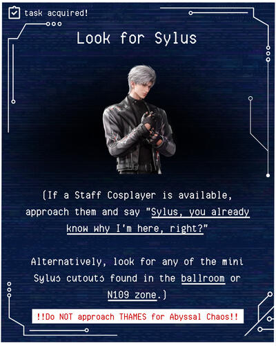 You look for Sylus.(If a Staff Cosplayer is available, approach them and say "Sylus, you know why I'm here, right?")(If a Staff Cosplayer is currently busy or not available, look for any of the mini Sylus cutouts found in the ballroom or N109 zone for a hint.)