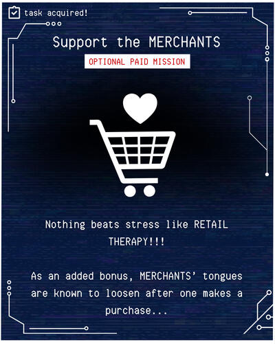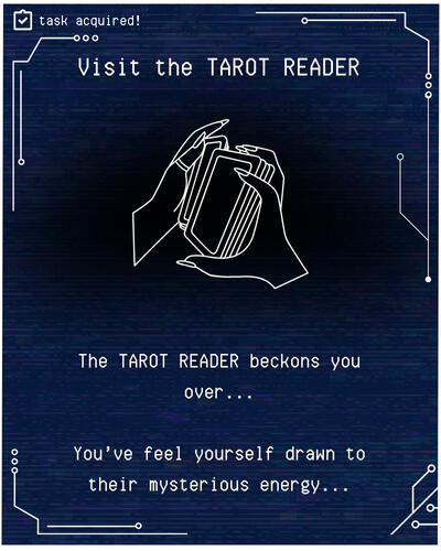 The merchant looks nervous as they hand you your items, their arms trembling slightly. Then, they suddenly lean in close and whisper:"Watch yerself out there. Something strange's been happening around that fortune teller. Weird vibes and all that. Don't get too close to 'em, y'hear?"You have no sense of self-preservation - you suddenly feel an urge to investigate the Tarot Reader.