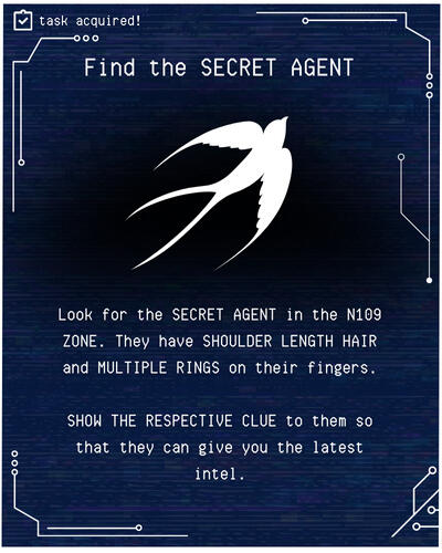 Swallow slips you a coded message.You use your Hunter's Watch to decrypt it:"They're going to conduct the trade TONIGHT by the tree in the courtyard.*The signal to start the trade is to make an inverted V with 2 fingers.*Also, the Rogue Broker has men spying on the Twinkle Toys area. Something--or someone--is of interest to them there."