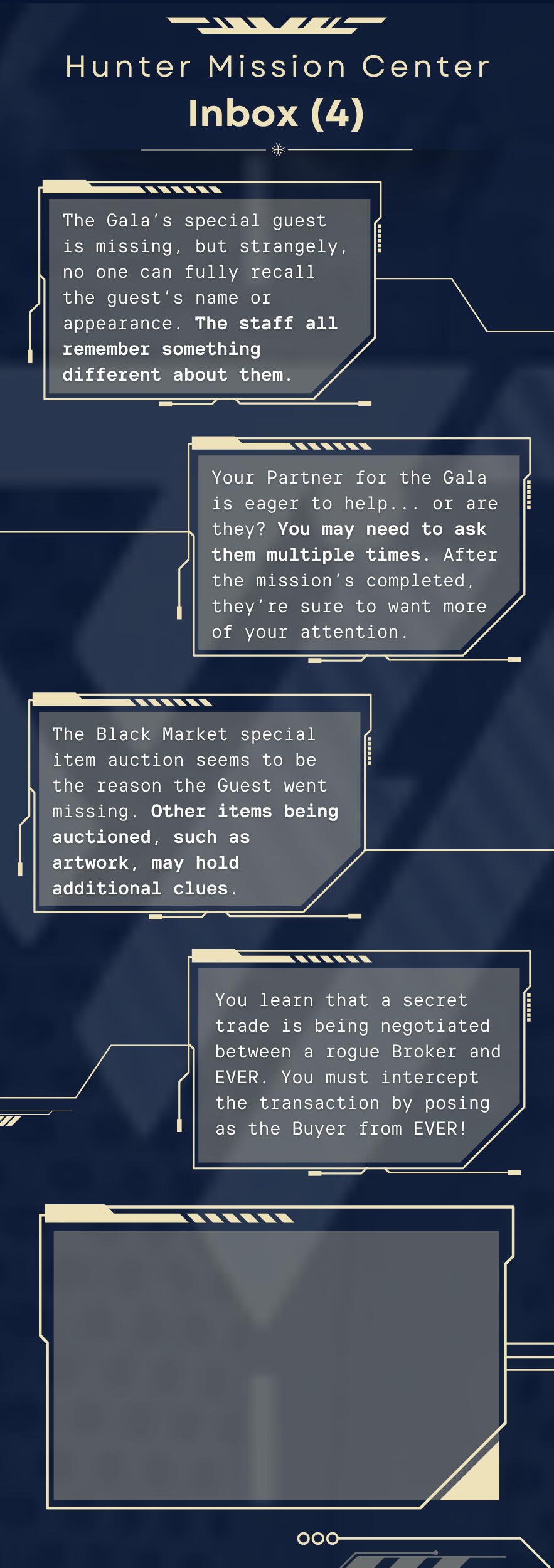 The Hunter Mission Center has received intel that EVER has been strangely active near the venue recently. It seems like they're participating in some kind of underground auction hosted by major N109 players...
