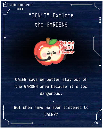 You find Caleb and immediately blurt out, "Caleb, this is urgent!" You must've sounded more panicked than you realized, because he immediately begins reassuring you."Whoa there, pipsqueak. Calm down. I'm here. This is about your work, right?You nod."I have a private drone programmed to do some reconnaissance - I'll send it to assist you."